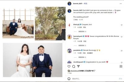 26岁来自西连的波尼,昨天在Instagram个人社交媒体发布与另一半的数张婚纱照,虽然只是很简单的宣布,也立刻收到众人祝福及祝贺,逾1万2000名用户为他们送上祝贺,包括大马青年及体育部长杨巧双、同样来自砂拉越的女子跳水好手拿督潘德莉拉、大马壁球女王拿督妮柯以及前体育部长凯里等。