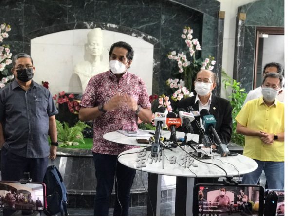 联邦卫生部与砂灾难管理委员会进行接种疫苗及疫情管理特别会议后召开新闻发布会,左起卫生部第二副部长拿督艾伦达干、卫生部长凯里、砂副首长兼灾难管理委员会主席拿督阿玛道格拉斯和砂地方政府及房屋部长拿督斯里沈桂贤。