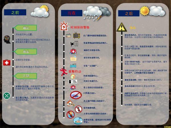 指南显示,在水灾来袭之前,民众事先可准备急救箱、应急毯、后备电池、多功能刀、多功能手电筒及净水片。