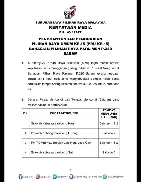 (美里19日讯)基于天气恶劣,选举工作人员无法通过水陆空抵达执勤地点,选委会宣布中止P.220峇南国会选区11个投票中心的投票活动。