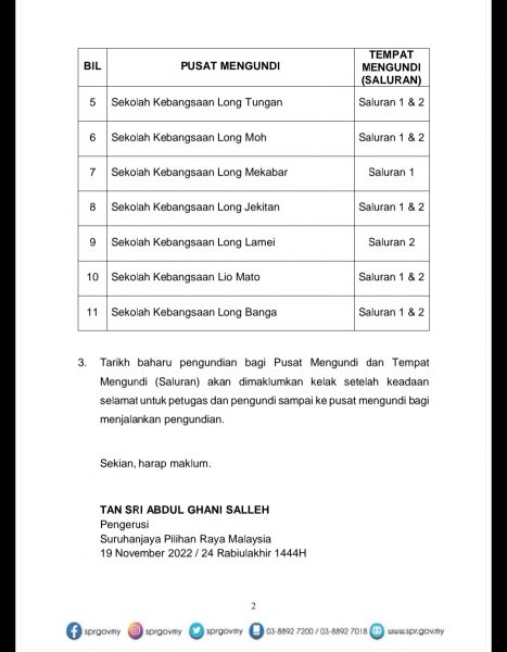 大马选委会主席丹斯里阿都甘尼今日发出文告指出,这些投票中心是弄那阿国小(2个投票箱)、弄鲁登国小(2个投票箱)、甘榜勒波巴柏鲁洛拉罗马修长屋(2个投票箱)、弄沙益国小(2个投票箱)、