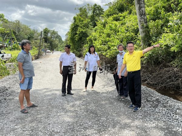 武吉阿瑟区州议员钱进一(右)、诗巫市议员方孝清(左二)、社区领袖徐丽凤(中)在居民陪同下勘查建东路修缮进度。