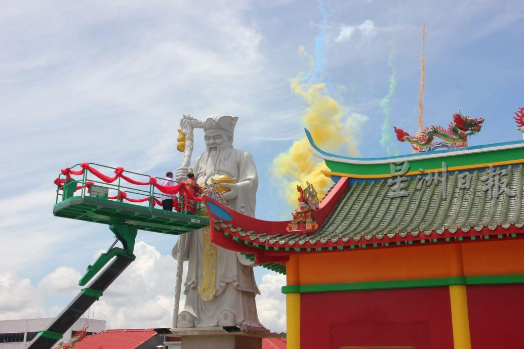 昨日开光的站立式大伯公神像号称是东南亚最大的大伯公神像。开光仪式结束后,主当局燃放白天烟花及日景彩烟助兴,现场善信高呼“兴、旺、发”口号。