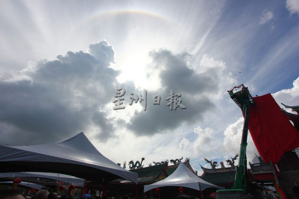 大伯公神像开光仪式开始时,上空出现半日晕,还有乌云遮荫,令善信啧啧称奇。