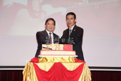 肖建国与拿督刘光明也共切中国国庆日蛋糕。