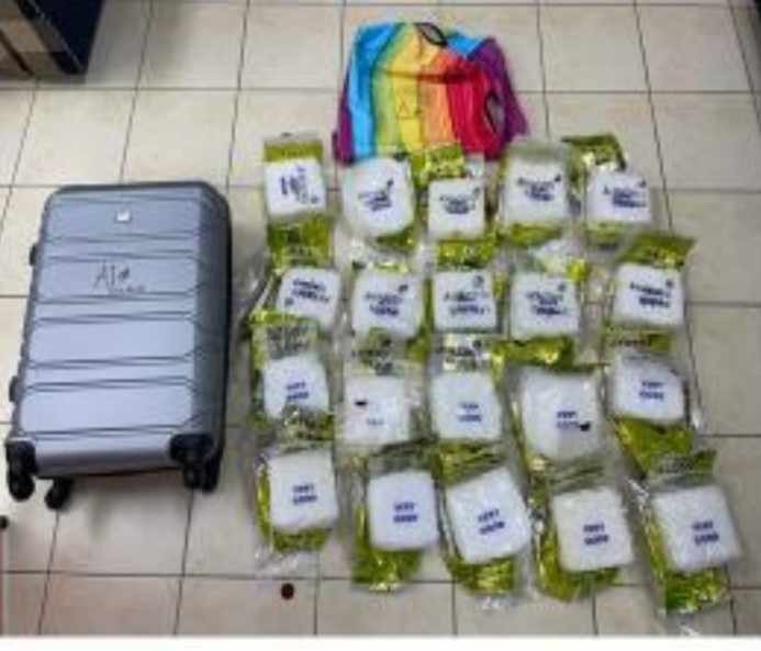 在进一步检查2件行李后,发现共有14个印有鱼形图案的黑色包裹,内含疑似冰毒的结晶粉末,估计毛重14.178公斤,价值49万7600令吉,而根据所获得的毒品重量,预计总共避免7万890人吸毒之害。
