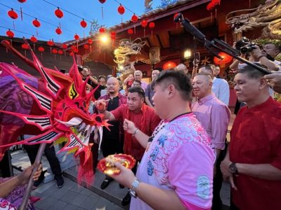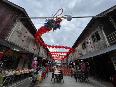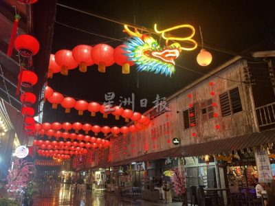 (古晋20日讯)长达298尺的巨龙灯笼装饰,腾飞在新尧湾百年老街之间,相信是砂目前最长的巨龙灯笼装饰!