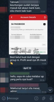 男子也披露,前天有一名群友自曝自己投资3万令吉。昨天下午,该群友发“好消息”声称自己在两天赚了1万5000令吉,该投资公司把总数4万5000令吉汇到他的银行户头。