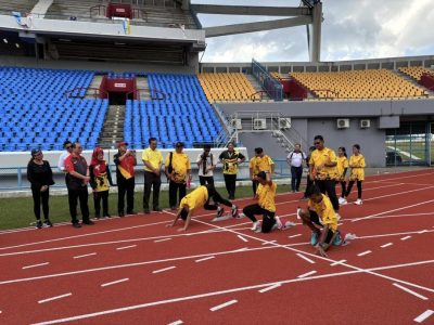 砂妇女、儿童及社区和谐发展部长花蒂玛阿都拉(左三起)、砂残运会代表团副团长比利苏章及叶耀星到砂体育场巡视砂田径运动员备战情况。(砂总理署公关单位图)