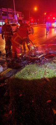 另一方面,消拯员闻讯赶到车祸现场把火扑灭,但整辆摩托车已被烧成废铁。