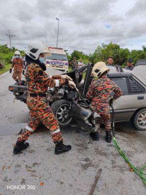 消拯员抵达现场发现涉祸轿车车头严重撞毁,男司机在车祸发生后被民众从车里移出,而其坐在前座的母亲则夹困车里,消拯员使用器材展开救援工作。