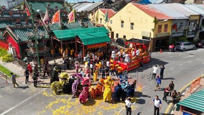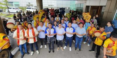 两尊金身抵达古晋福建公会花香街凤山寺,受到信众及舞狮队迎接。