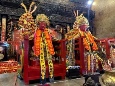 中国福建南安诗山凤山寺祖庙广泽尊王金身(右)与妙应仙妃金身(左)首次出国巡游,两尊金身安置在古晋福建公会花香街凤山寺并开放给信众敬拜。
