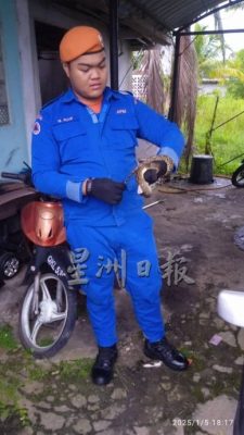 民防部队成员1月5日傍晚接获求助来电,在朋尼逊路7哩圣淘沙镇附近协助捕获一条潜入住家的小蟒蛇。