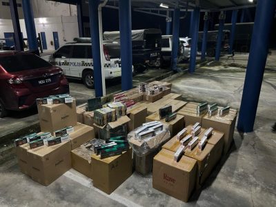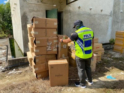 “警方在现场查获2169盒香烟及3326.4公升各类酒精饮品,市价约值168万9258令吉。案件已移交木中警区,援引1967年关税法令135(1)(d)条文调查。”