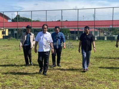 砂食品工业、原产业及区域发展部副部长(食品工业)阿都拉曼依斯迈(左二)在德沙巴巴哈南查看足球场。