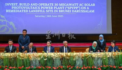 (汶莱斯里巴加湾16日讯)汶莱签署联合投资协议、土地租赁协议及电力购买协议签署仪式,旨在投资、建设及运营位于甘榜柏林宾苏柏的30兆瓦太阳能光伏发电厂。签署仪式于前午在首相署宴会厅隆重举行。