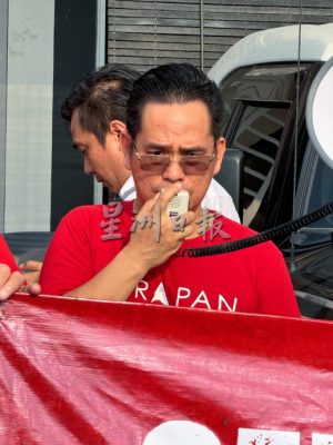 (古晋26日讯)砂公正党领袖及党员连同非政府组织代表,今日下午在砂土团党总部外高喊“保留安华”口号,声援首相拿督斯里安华,借此反击国盟在吉隆坡举办的“倒安华集会”。