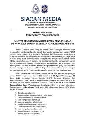 (古晋8日讯)配合第68届国庆日,砂交通调查与执法组将本月26日至28日,特定交通罚单享有50%折扣。
