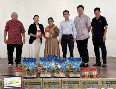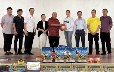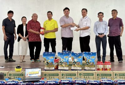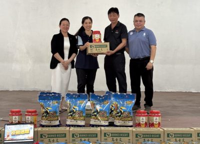 善心团队队长苏子灿(中)在众人的见证下,移交物资予端必腊中华公学,由教师董娘桃代表领取。