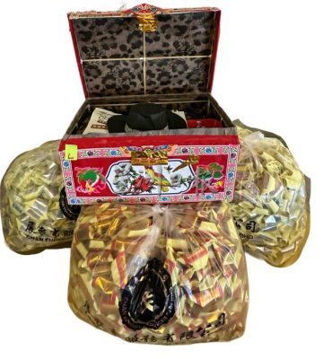 在祭品方面,一般会准备金纸,象征财富与功德,焚化后送往先人或神明处,表达敬意与孝心。金色寓意阳、尊贵与吉祥,多用于祭拜祖先或天界神祇;银纸象征阴间货币,焚化后供先人在冥界使用,帮助衣食无缺。银色寓意阴、安宁与护佑,多用于普渡好兄弟、地府众生;红衣箱,内含纸制衣物、帽子等生活用品,焚化后送给先人,寓意关怀与祝福,让其在另一世界衣食丰足。红色象征喜庆、圆满,祝愿先人在阴间生活安乐。