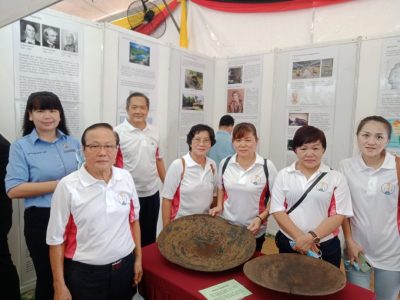 2020年,在石隆门庆祝开埠200周年的纪念活动上,华工史迹文化遗产学会的部分成员们展示旧时代的其中一种淘金工具。后为主席黄扬浪,前为秘书黄绍腾。(档案照)