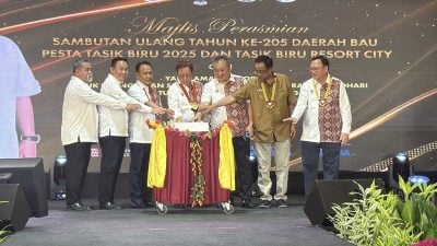 2025年5月15日,砂总理阿邦佐哈里(中)与众嘉宾为石隆门开埠205年周年主持切蛋糕仪式。(档案照)