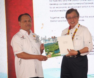2019年12月,石隆门区议员亨利吉纳向时任首长阿邦佐哈里展示2016至2030年石隆门发展大蓝图书籍。(档案照)