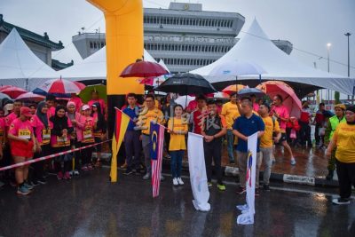 砂拉越聋人体育协会主办的“2024年无声义跑4.0”。右起为马来西亚聋人体育协会王心润、高明亮、国会下议院副议长兼南兰区国会议员刘强燕、诗巫区国会议员林财耀一同主持挥旗礼。