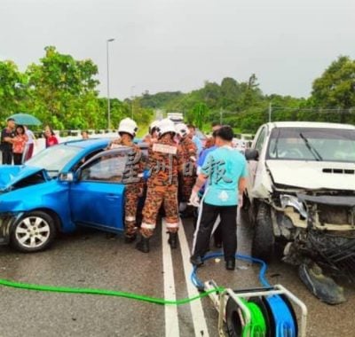 这起车祸于昨午2时20分,在加拿逸大桥上发生。事发时正下雨,怀疑因路滑导致轿车失控撞上货卡。