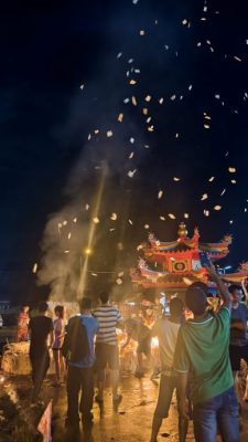而庙外焚化纸钱叠成的‘金山银山’,以示敬奉,场面壮观,尤其纸钱随着热气在空中飞舞并飘向远处,许多民众纷纷拿出手机拍摄纪录。