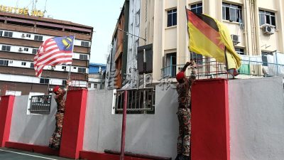 昨早,奥玛率领5名消拯员列队致敬辉煌条纹和祖国旗后,2名消拯员达拉曼和恩巴兰分别将两旗插在围墙柱上,迎接明日到来的大马日。