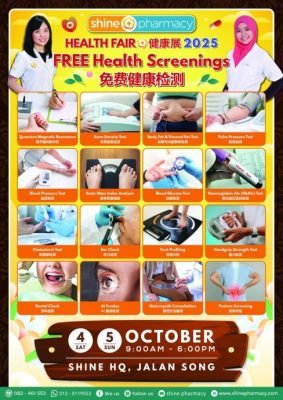 欢迎民众在来临周末前往SHiNE Pharmacy全砂最大型健康展。欲知任何详情,可致电082-461553查询,营业时间从早上8时30分至晚上9时30分,天天营业。