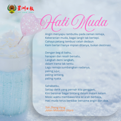 Sajak “Hati Muda” karya Toh Zheng Feng mengangkat keindahan dan kejujuran zaman remaja yang penuh semangat, impian dan kenangan. Ia menggambarkan jiwa muda yang bebas, berani dan tulus dalam mengejar cita-cita, meskipun arah hidup berubah mengikut waktu. Ia menyorot waktu remaja sebagai fasa yang paling jujur dan lantang dalam mencari makna hidup, walaupun arah masa depan belum jelas。