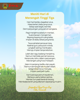 SAJAK “Meniti Hari di Menengah Tinggi Tiga” karya Jacqueline Tiong Kung Ling menggambarkan perjalanan seorang pelajar menengah tinggi yang penuh cabaran, harapan dan semangat juang. Ia menyentuh aspek kehidupan harian pelajar yang sarat dengan usaha, pengorbanan dan impian masa depan. Sajak ini bukan sekadar