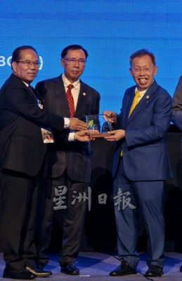 砂拉越兽医与服务局局长拿督安德廉(左)赠送纪念品给予砂拉越副总理拿督阿玛沈桂贤(右)。中为砂拉越食品工业、原产业及区域发展部长拿督斯里史蒂芬伦迪。