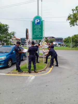 古晋警区商业罪案调查组于昨日展开行动,共动员2名高级警官与39名警员,在市区各地执行拆除广告布条的行动。