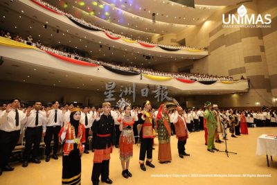 新生代表巫瓦斯希尔米(前左七)引领穿著各族服饰的全体本地及国际新生进行宣誓,场面非常壮观。(砂拉越大学脸书图)(砂拉越大学脸书图)