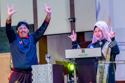 花蒂玛阿都拉(右)开心宣布,砂政府将向所有获奖的聋人运动员颁发奖励金,创下残障运动会史上历史突破。(砂总理署公关单位图)