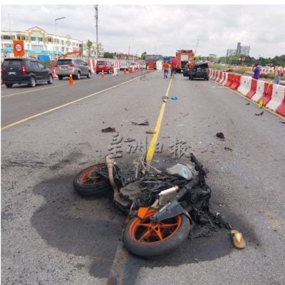 据悉,死伤者摩托车是朝心脏专科中心方向行驶,途中刹车不及猛撞轿车尾部,并涉及一辆重型罗里,酿成1死1伤悲剧。