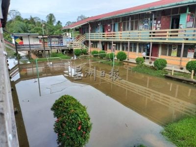 (马鲁帝24日讯)峇南阿博河弄孟满又受灾。长屋区水深1.4尺,当地国小校园水深2.5尺。