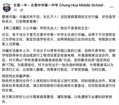 古晋一中在脸书发出紧急通告,提醒民众警惕,避免受骗。