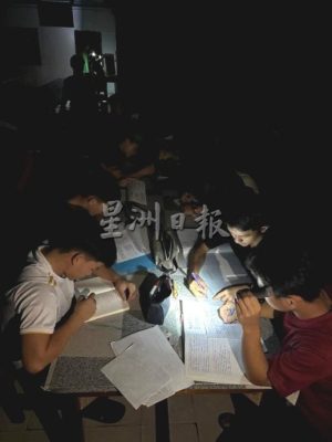 该校一群即将应考大马教育文凭考试(SPM)的学生,靠微弱的手电筒与烛光努力温习。
