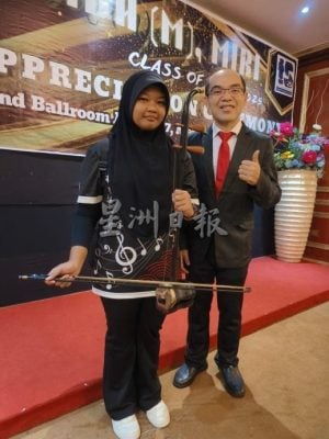 (美里26日讯)她听不懂中文,却用二胡拉奏出动人旋律。美里圣哥伦巴国中中二穆斯林学生伊尔蒂娜巴翠希雅以一曲二胡演出惊艳全场,不仅打破语言与文化的界限,更以坚持与热爱,诠释音乐无国界的真谛。