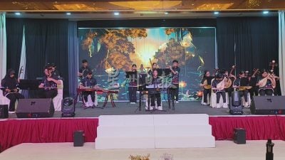 美里圣哥伦巴国中昨早举行2025年度杰出学生奖颁奖暨中五毕业典礼。活动由该校华乐团演奏揭开序幕。其中,伊尔蒂娜巴翠希雅在一众华裔演奏者中神情专注、热忱地拉奏二胡,引起注目。