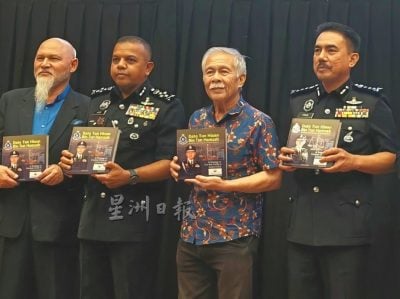 嘉宾们在《打破黑帮枷锁,砂拉越治罪策略》新书推荐礼上合影,共同展示这本记录砂拉越反黑帮历程的著作,左起为新书特别顾问敦希山、全国副总警长阿育汉、国家图书发展基金会主席阿都拉迪夫以及砂警察总监莫哈末再纳。