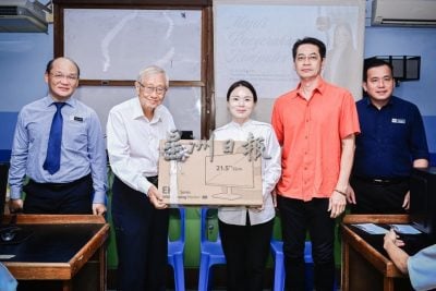在这10台电脑安装后,刘强燕亲自到现场查看,并且进行移交仪式,在校长林垂义及家教协会主席陈为平等人见证下,象征性移交10台电脑予卫理中学董事长陈锡监。