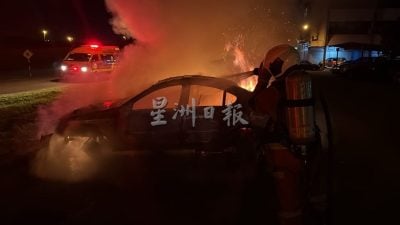 民都鲁消防与拯救局接获投报后赶抵现场时,发现现场一辆汽车已被熊熊烈火包围。经现场勘察后,确认该辆轿车已100巴仙烧毁。