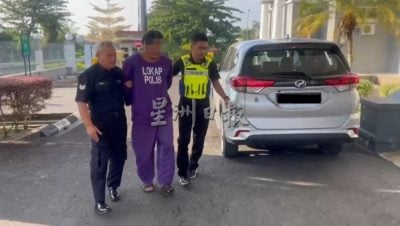被告安东尼(51岁)今早被玛都警方押解到泗里街法庭面控刑事恐吓及蓄意破坏两项罪名。