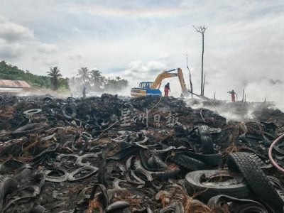(古晋2日讯)消拯员持续在晋连路9哩旧轮胎收集处展开灭火行动,经过连日奋战,目前火势已成功扑灭约70%,仍有约30%火点集中在后方,因其中一台神手故障,导致进展受阻。